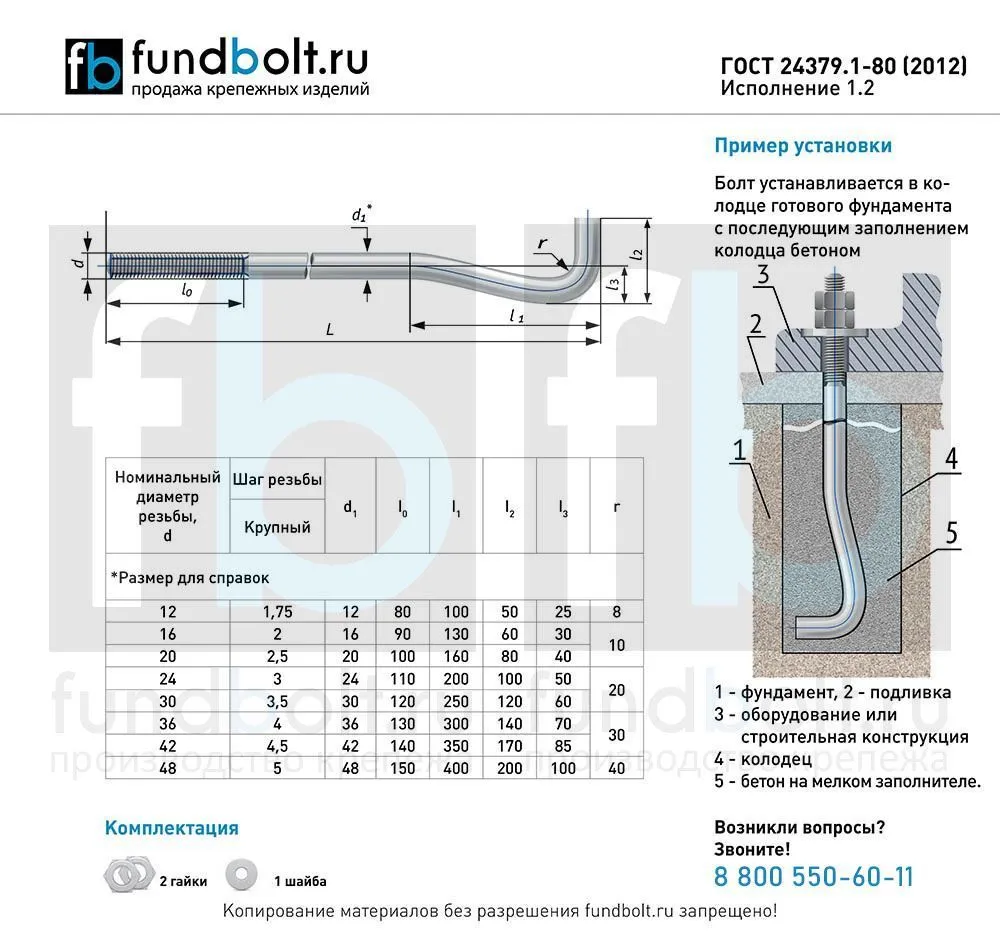 48х1500 1.2 Фундаментный анкерный болт ГОСТ 24379.1-80(2012), 09Г2С, Резьба 300 нашего производства характеризуется Г-образной формой конца, что значительно увеличивает сопротивление выдергивающим нагрузкам. Точное соблюдение геометрических параметров и применение качественных стальных сплавов гарантируют долговечность и надежность крепления в самых сложных условиях эксплуатации.