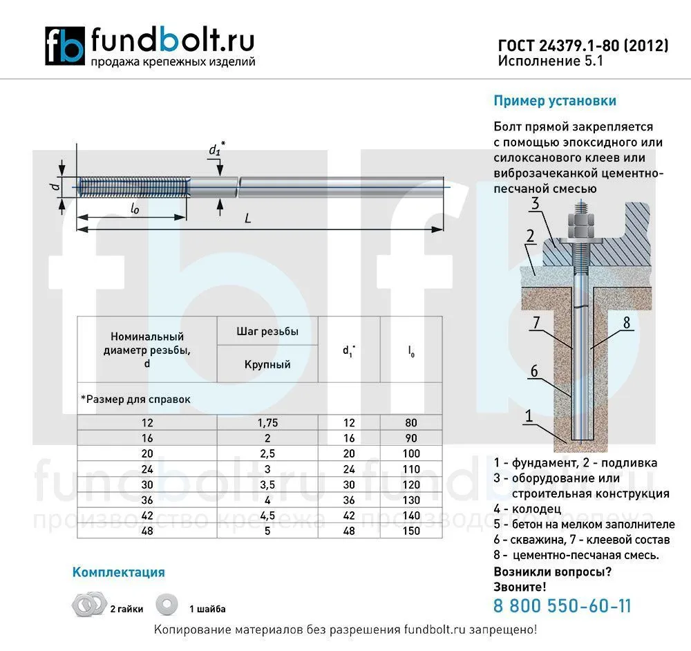 Специализируемся на изготовлении прямых фундаментных болтов исполнения 5.1 по ГОСТ 24379.1-80(2012). Конструкция изделия представляет собой прямой стержень с метрической резьбой, предназначенный для установки в предварительно подготовленные отверстия. Для крупных проектов предлагаем индивидуальные условия сотрудничества.