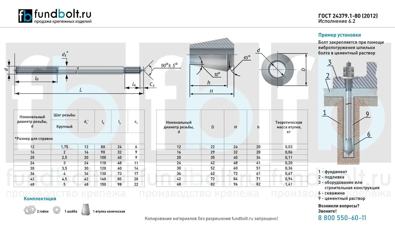 Специализируемся на производстве анкерных болтов тип 6 исполнение 2 по ГОСТ 24379.1-2012. Болт типа 6.2 по ГОСТ 24379.1-2012 — это фундаментный болт со съёмной шпилькой. Его главный смысл и преимущество — возможность многократной регулировки и удобство монтажа тяжелого оборудования, которое может потребовать регулировки или замены.