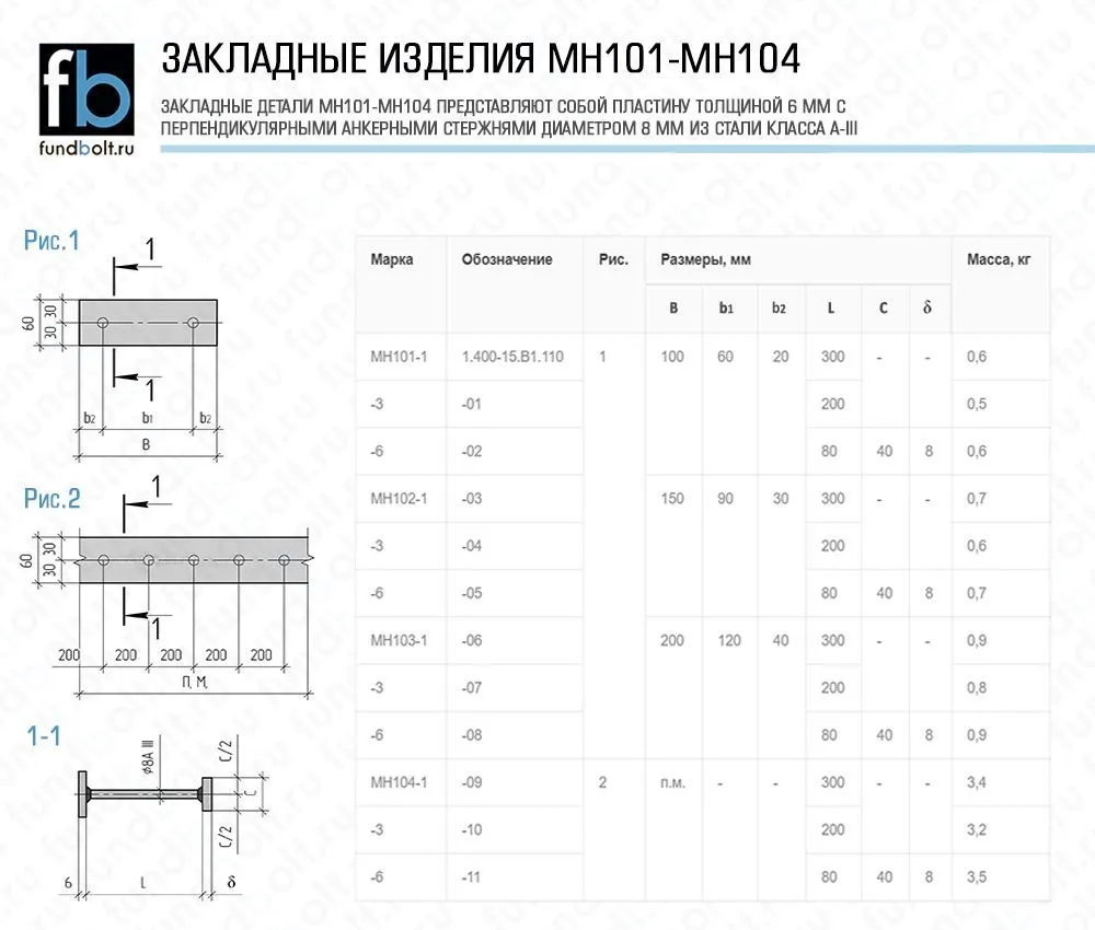 Закладное изделие МН 104-6 Серия 1.400-15 выпуск 1, Длина 950